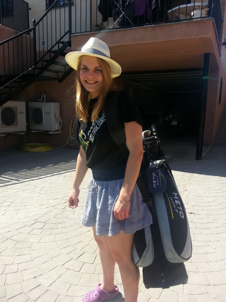 Día perfecto de abril. Soleado y con la temperatura justa. Nada que hacer. Y se me ocurre…¿sabes jugar al golf? ¿quieres intentarlo? Esta no sabe decir que no, así que me fui a por los palos y las pelotas de entrenamiento.